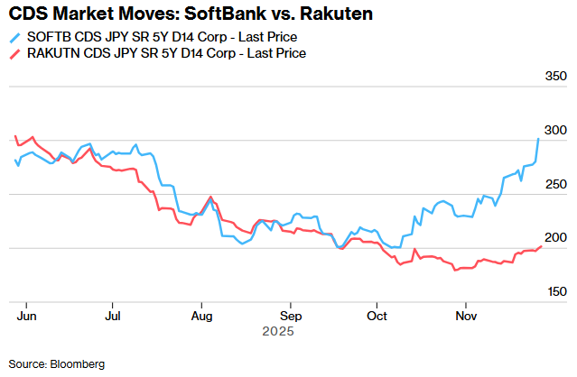 该公司一直通过平仓为众多AI项目提供资金——从与OpenAI和甲骨文公司合作的“星际之门”数据中心到美国的机器人制造基地。根据汇总的数据,其五年期CDS在周四升至约302个基点,高于前一天的约280个基点。