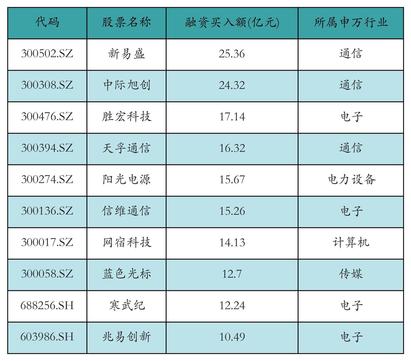 两市共有3480只个股有融资资金买入,其中新易盛、中际旭创、胜宏科技排名前三,买入金额分别25.36亿元、24.32亿元、17.14亿元。融资买入额前10个股详情见下表: