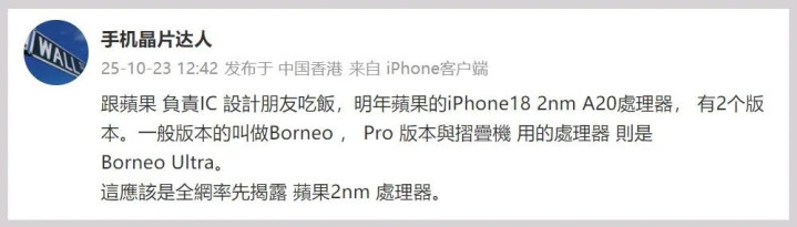 博主@手机晶片达人透露,iPhone 18标准版将搭载A20芯片(代号Borneo);而iPhone 18 Pro系列及折叠屏iPhone,则将搭载A20 Pro芯片(代号Borneo Ultra)。