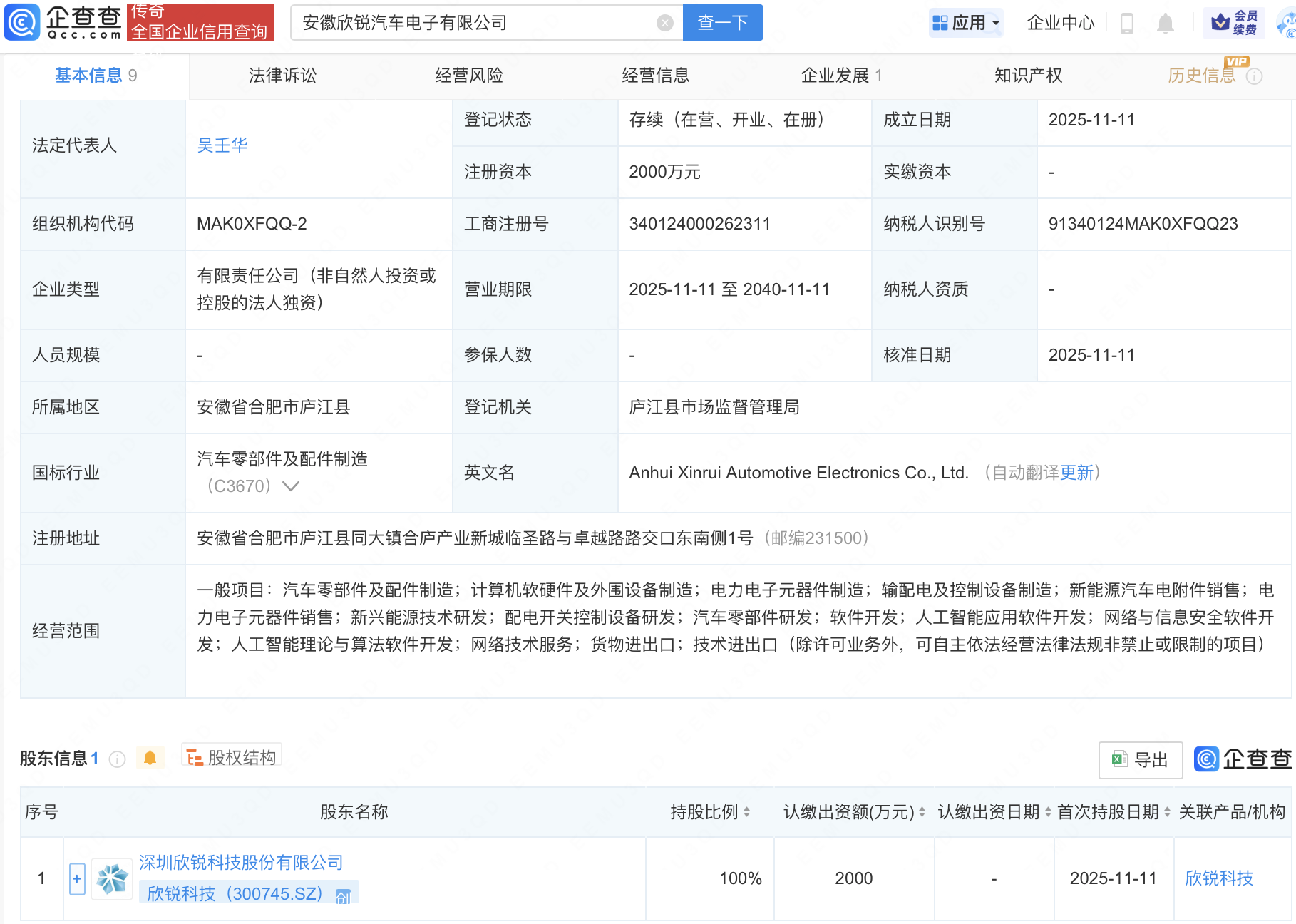 近日配资论坛官网登录入口,安徽欣锐汽车电子有限公司成立,注册资本2000万元,经营范围包含:人工智能应用软件开发;网络与信息安全软件开发;人工智能理论与算法软件开发;网络技术服务等。企查查股权穿透显示,该公司由欣锐科技(300745)全资持股。