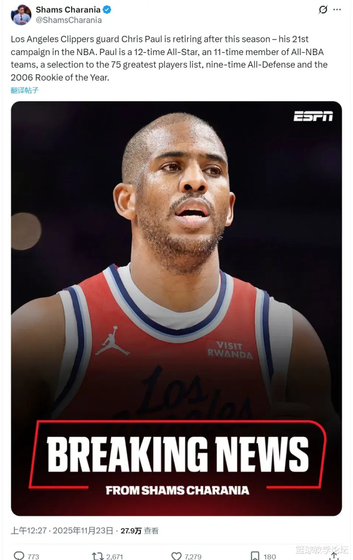 北京时间11月23日凌晨,NBA名记Shams报道,快船后卫克里斯-保罗宣布,将在本赛季结束后正式退役,结束21年生涯。今天快船对阵黄蜂,保罗回到自己的家乡北卡罗来纳州:“多么精彩的一段旅程配资论坛官网登录入口,依然有许多不舍,感激这最后一程。”