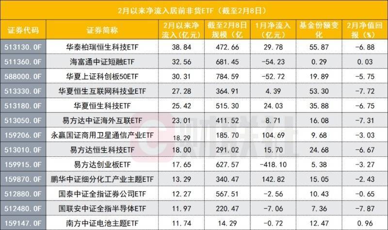 虽然2月仅过去一周,但非货ETF的资金流向已和开年大有不同。数据显示,截至2月8日非货ETF合计净流入84.7亿元,此前1月,非货ETF净流出逾8000亿元。