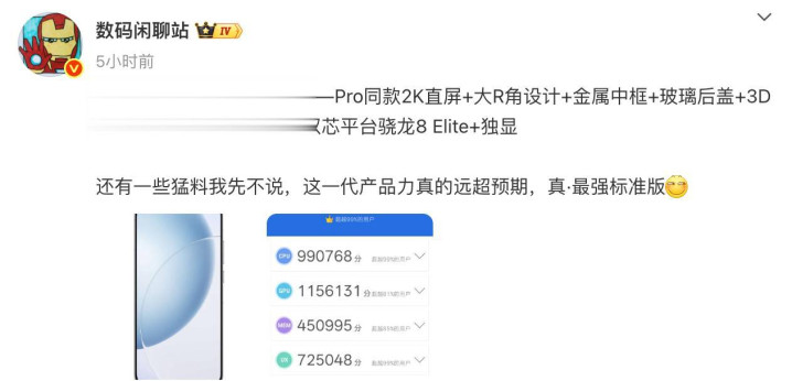 这次 GT8 标准版也一块发,都是在 10 月。据爆料,标准版采用 Pro 同款 2K 大 R 角直屏 + 金属中框 + 玻璃后盖 + 3D 超声波指纹,搭载上一代旗舰芯骁龙 8 Elite,还有独显芯片加持。