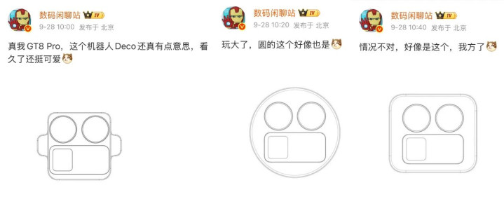 博主@数码闲聊站 今天一次曝光了三版方案,第一版就是上图那种不规则的 DECO,而第二版则变成了圆形,还有第三版矩形。