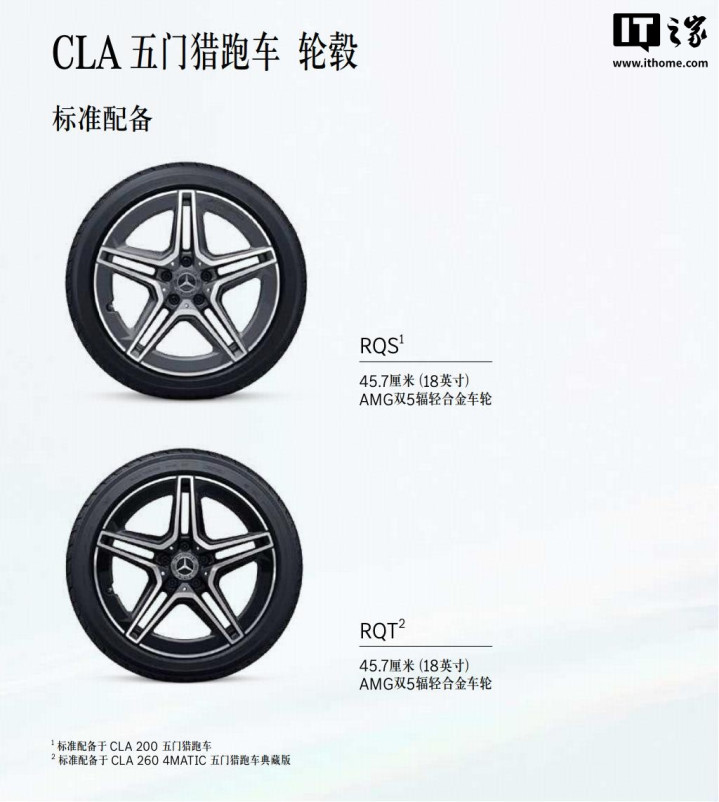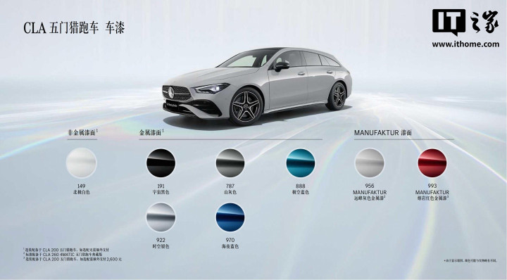IT之家注意到,外观设计方面,2026款奔驰CLA五门猎跑车造型保持不变,车身尺寸为4692毫米×1830毫米×1435毫米,轴距为2729毫米。车辆提供了丰富的外观配色选择,包括北极白色、宇宙黑色、山灰色、极空蓝色、时空银色、海夜蓝色、MANUFAKTUR远峰灰色金属漆和MANUFAKTUR熔岩红色金属漆等。此外,该车型还标配了18英寸轮辋,轮胎规格为225/45R18。