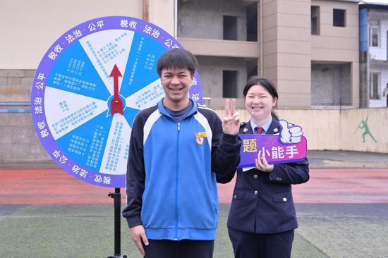 走进田径场,首先映入眼帘的是一面“税收知识大转盘”。同学们排着长队跃跃欲试,转盘飞旋,指针一停,问题抛出——“我国税收的本质是什么?”“取之于民,用之于民!”“发现有企业拒开发票,应该拨打什么电话?”“12366!”一问一答间,掌声和欢笑声此起彼伏。短短十几分钟,税收的起源、用途、主要税种就在转盘上转进了同学们的心里。